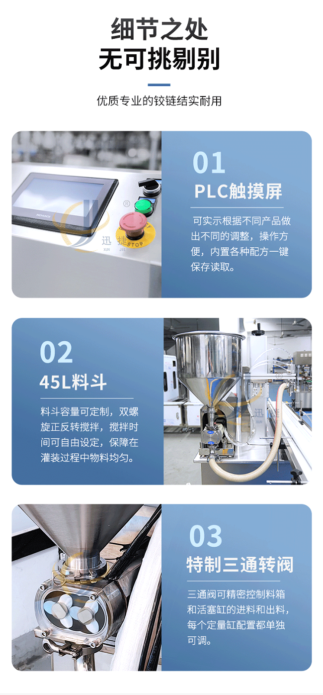 我公司新研發(fā)五極醬料灌裝機,五極分為極快,極簡,極穩(wěn),極廣,極準,廣泛適用于各種膏霜、蜂蜜、洗衣液、洗發(fā)水、半流體、蜂蜜、醬料以及各種粘稠物料,該產(chǎn)品支持定制,選用306不銹鋼材質(zhì),灌裝精度高,防止滴漏,選用plc觸屏智能控制,防滴漏防拉絲,突破傳統(tǒng)的灌裝方式,可根據(jù)瓶子高度調(diào)整灌裝頭高度,采用防滴漏設計,灌裝時不滴不漏。
