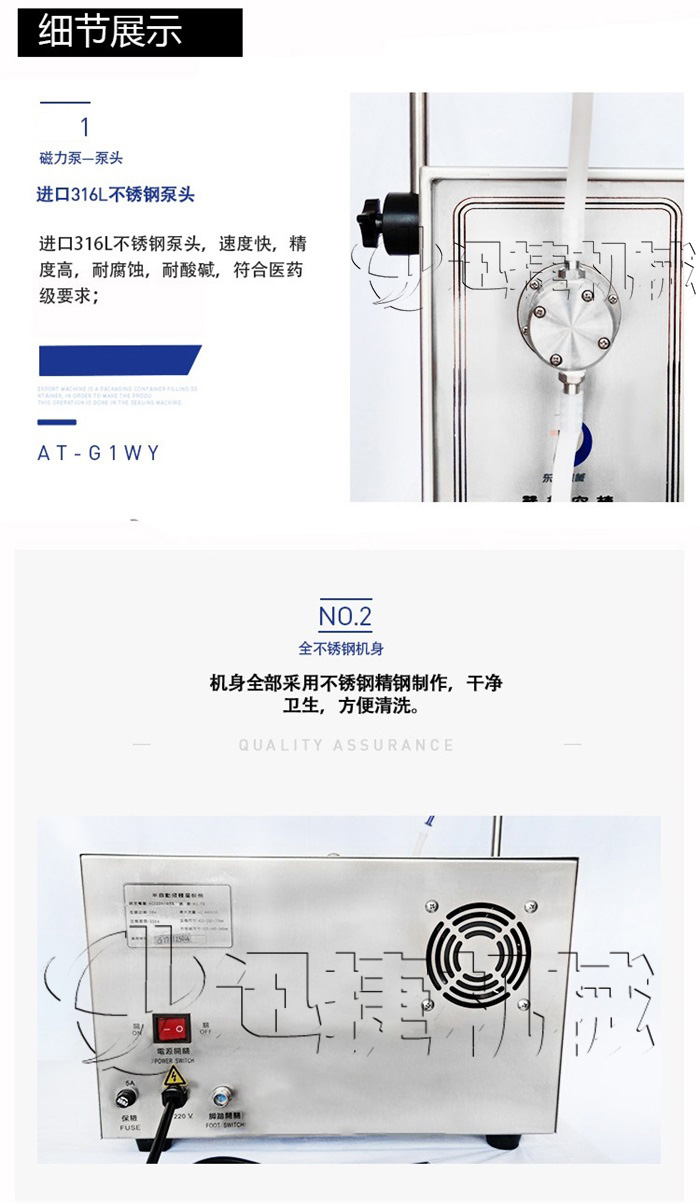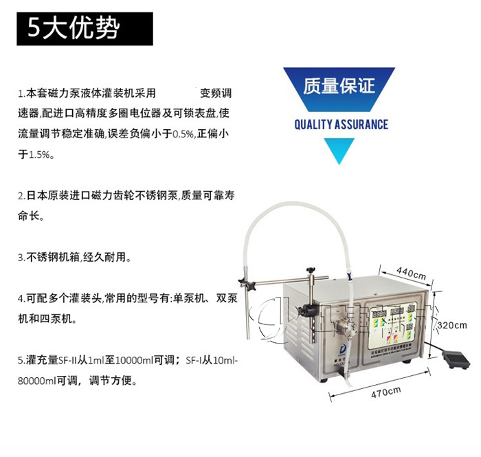 A、磁力泵液體灌裝機(jī)采用世界工廠變頻調(diào)速器,配進(jìn)口高精度多圈電位器及可鎖表盤,使流量調(diào)節(jié)穩(wěn)定準(zhǔn)確,誤差負(fù)偏小于0.5%,正偏小于1.5%;